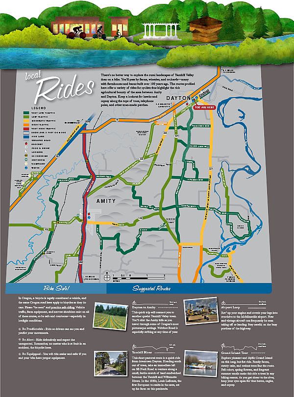The communities of Amity and Dayton joined hands through a Ford Foundation Cohort program with the goal to create informational kiosks that function both as works of art and provide practical tourist information. Each kiosk—with one centrally located in each city—promotes bicycle tourism between the two communities and around the Yamhill Valley. They also highlight local attractions and each town’s unique history.