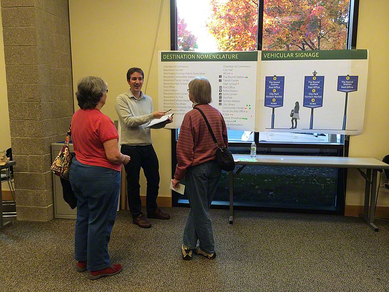 Typically projects with cities require opportunities for the general public to express interest or concerns for the location or design of a project that will be part of a public space. For wayfinding projects the list of stakeholders and public outreach can be extensive. Public meetings can be highly productive or a real bust and the difference is all in the preparation, knowing your audience, and creating a platform where everyone speaks. For the Beaveton Downtown Wayfinding open house, the city sent out the invitations and Sea Reach designed the format and conducted the meeting. It was important to us to hear all voices equally, so we set up a series of seven stations. Each manned by Sea Reach staff.