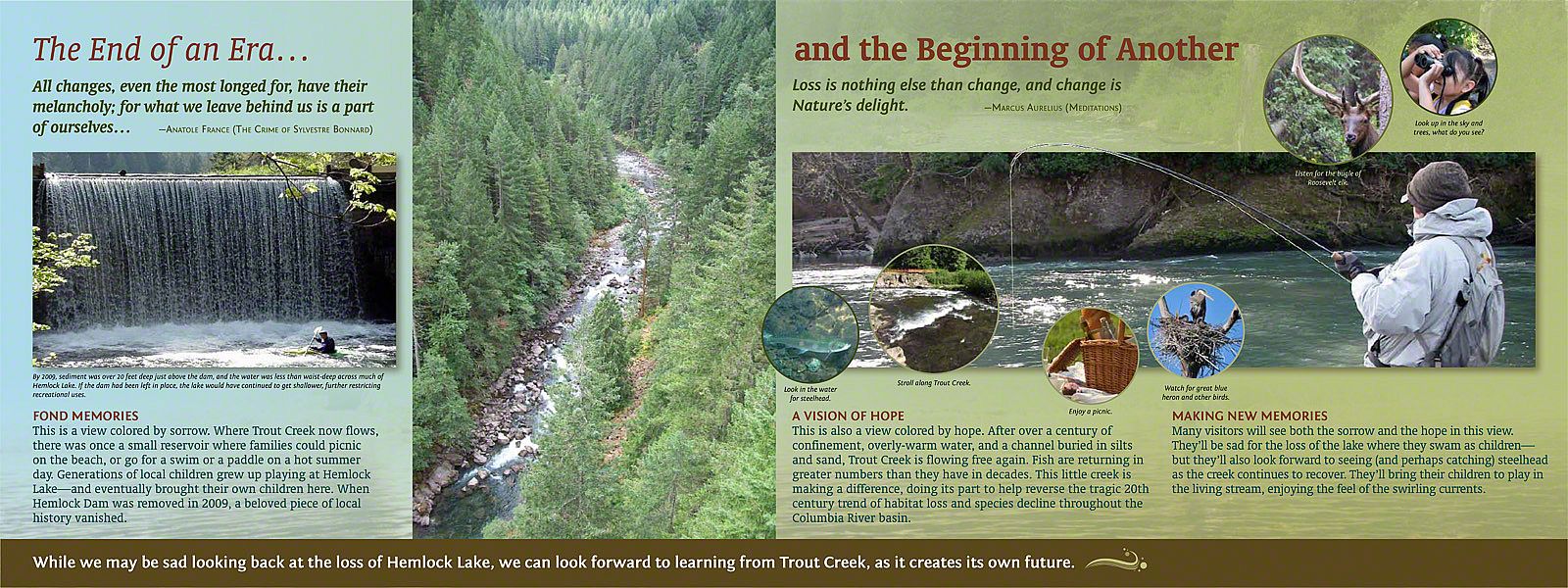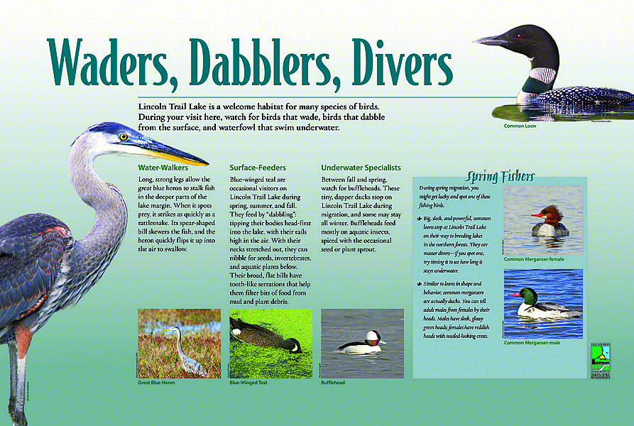 To enhance the visitor's experience and guide them along the 4-mile-long trail, a series of interpretive panels and maps were developed. They provide an overview of the diverse experiences and the history of the land on which the pathway meanders. A large woodcut illustration beckons the first time visitor as they approach the entrance providing a small taste of the wonders awaiting them on the trail.