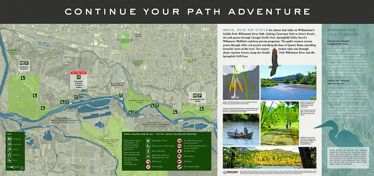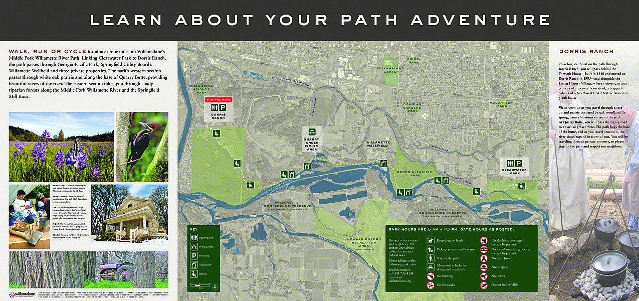 To further enhance the path's regional appeal, a bridge across the river is also in long-range plans. Such a bridge would provide access to Lane County's 2,300-acre Howard Buford Recreation Area and Mount Pisgah (another one of our projects), including 16 miles of trails.