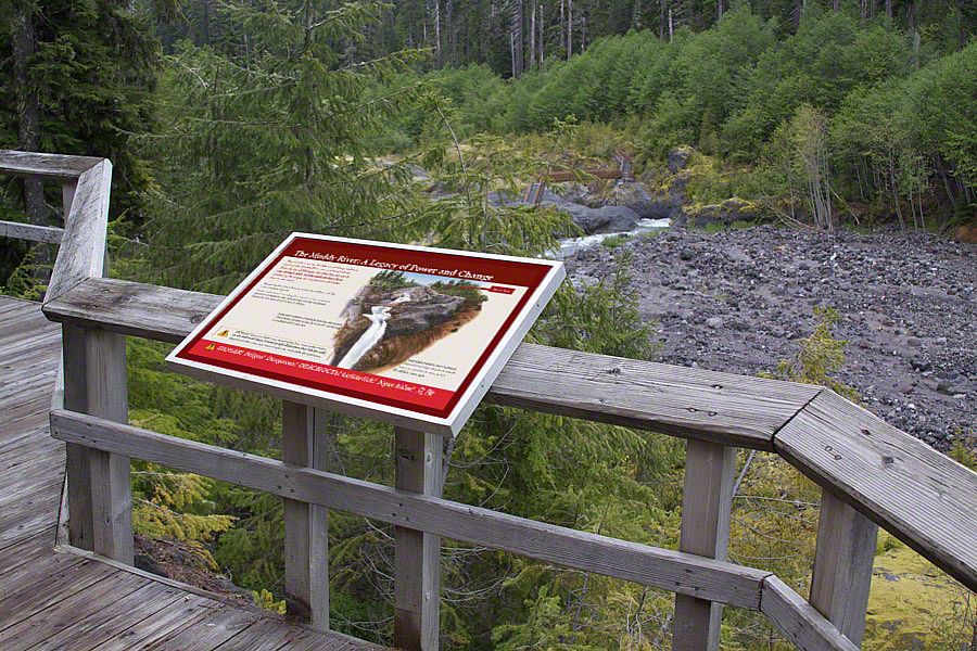 Today, the peacefulness felt in Lava Canyon is deceptive. A burbling creek enters the basalt canyon and unexpectedly hurtles 132-feet downward forming a spectacular and deadly waterfall. This waterfall has been responsible for at least three deaths since the Lava Canyon Trail opened. To help educate visitors and hikers about the dangers of the site, Sea Reach was asked to develop interpretive signs with drawings of the site showing the waterfall ahead and warning signs in multiple languages.