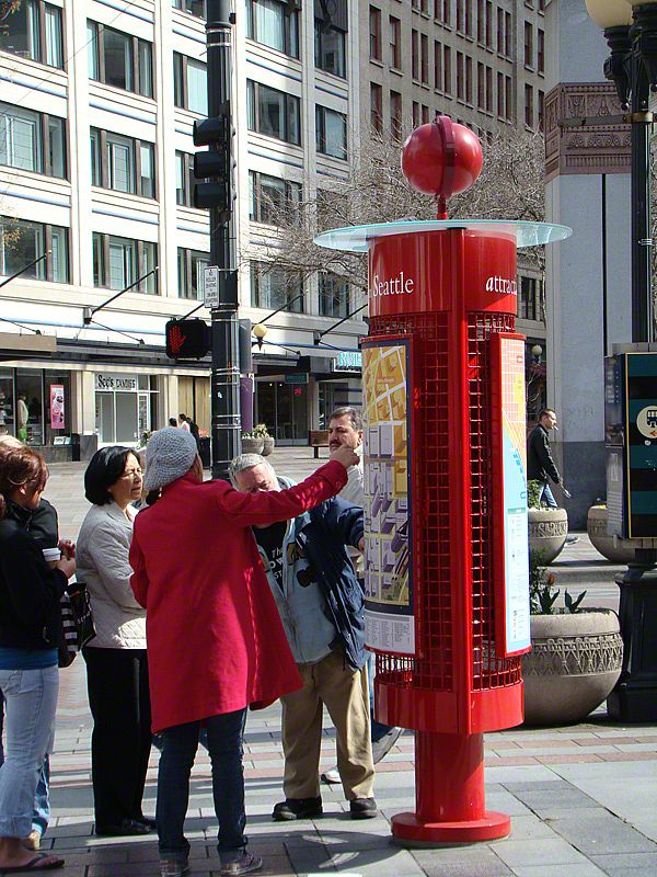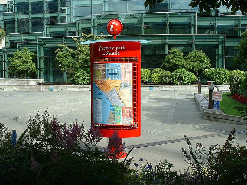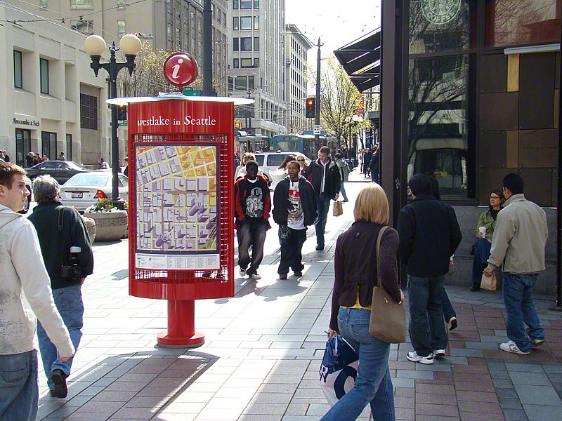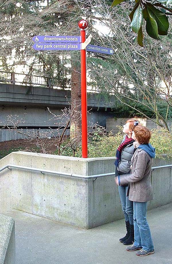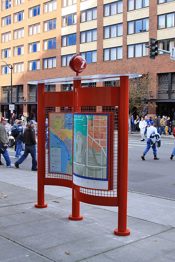The Seattle Wayfinding System is designed to link all modes of transportation into, around, and out of the city, providing a "seamless" information structure for both first-time visitors and repeat users. Integration of all types of media is key to a comprehensive and effective system.