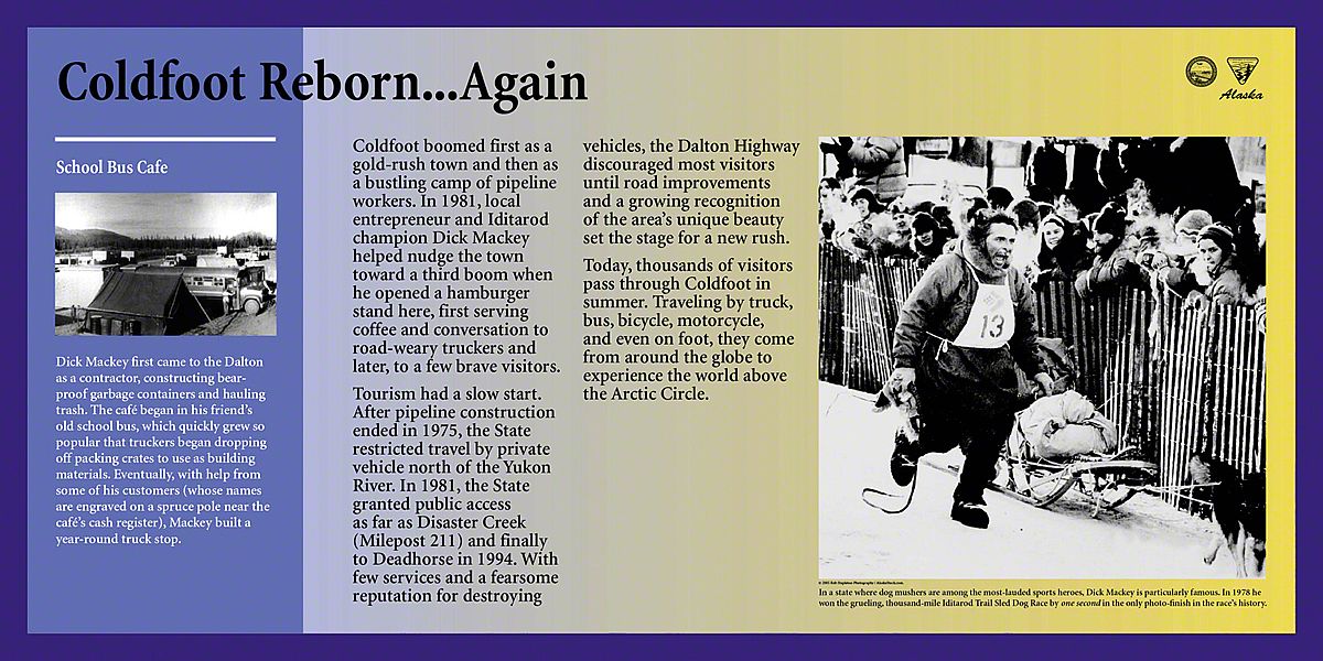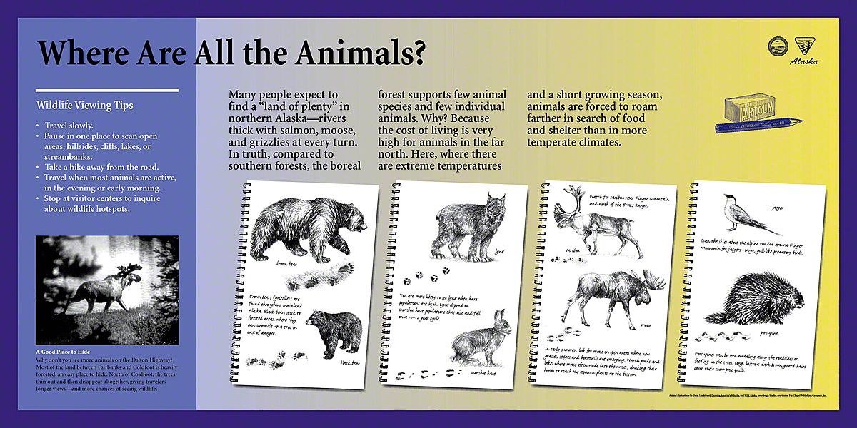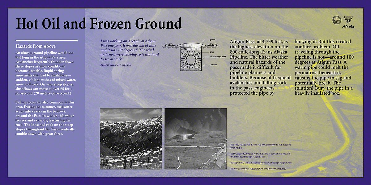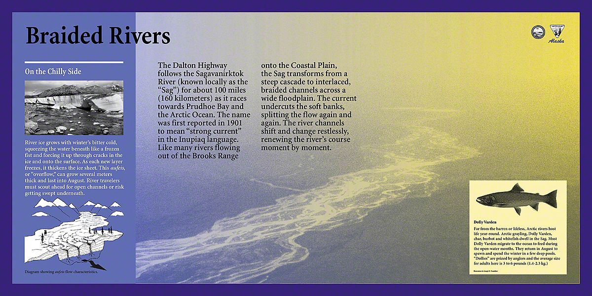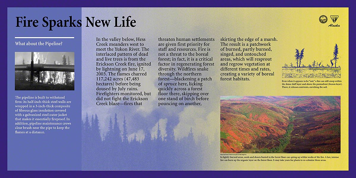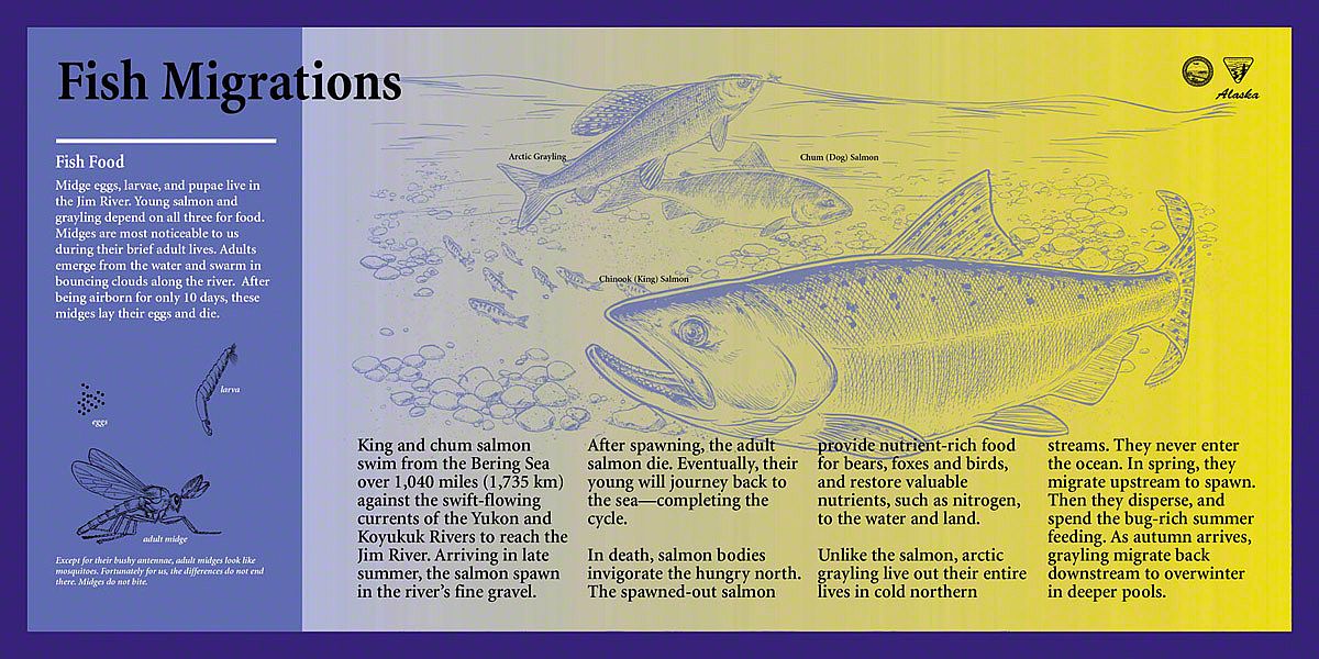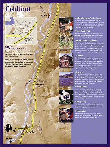 Today, the Dalton Highway is a thousand-mile-round-trip from bustling Fairbanks, Alaska to the edge of the world - beyond the Arctic Circle to the frozen shore of the Arctic Ocean - Prudhoe Bay. The diversity of landscapes over this long drive created an interesting design challenge. Sea Reach was responsible for the design and fabrication of over fifty 48" x 24" wayside exhibits and twelve orientation kiosks.