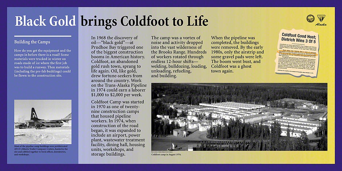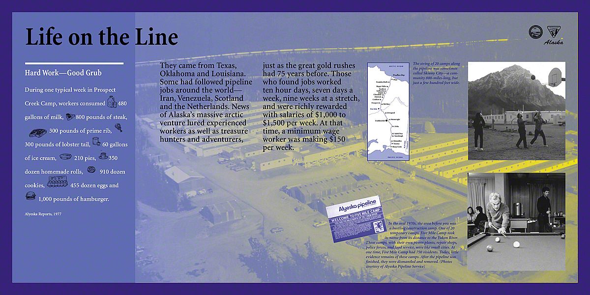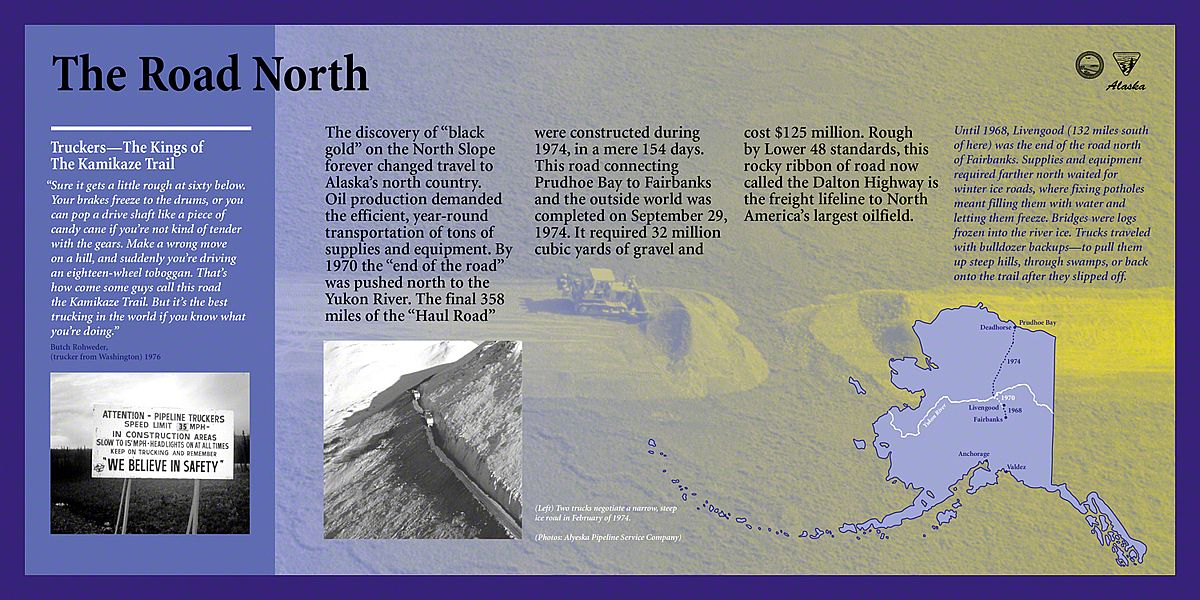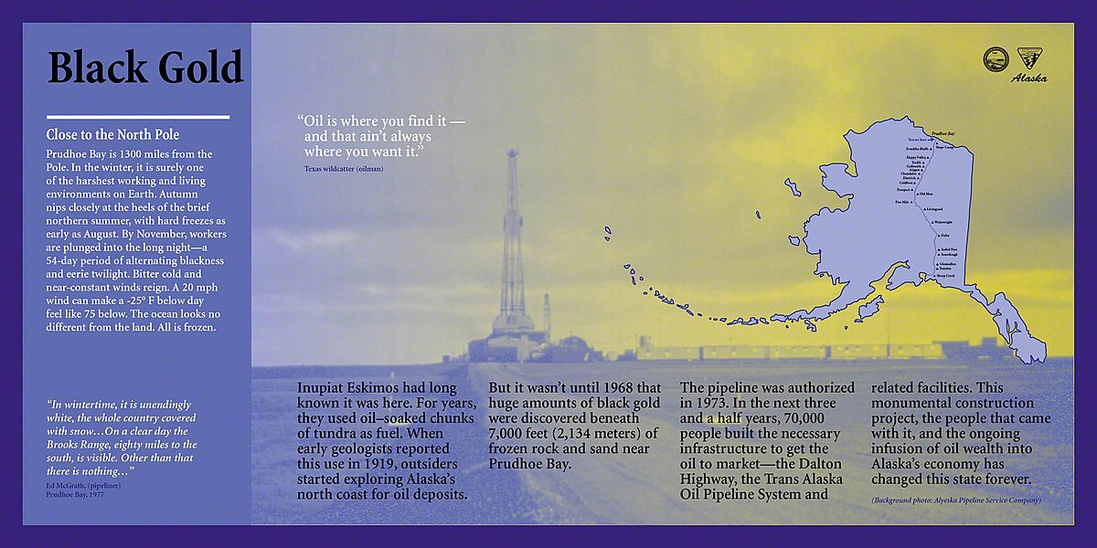 Inupiat Eskimos had long known about the huge amounts of black gold beneath the frozen rock and sand near Prudhoe Bay, Alaska. Then the Trans Alaska Oil Pipeline System was authorized in 1973. In the next three and a half years, 70,000 people worked to build the necessary infrastructure: the Dalton Highway, the Pipeline, and related facilities.