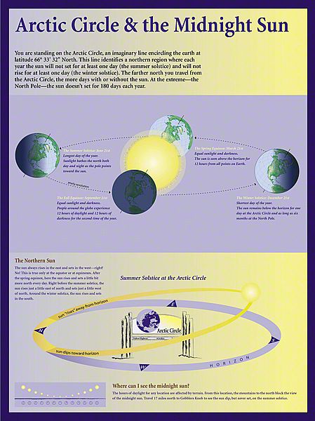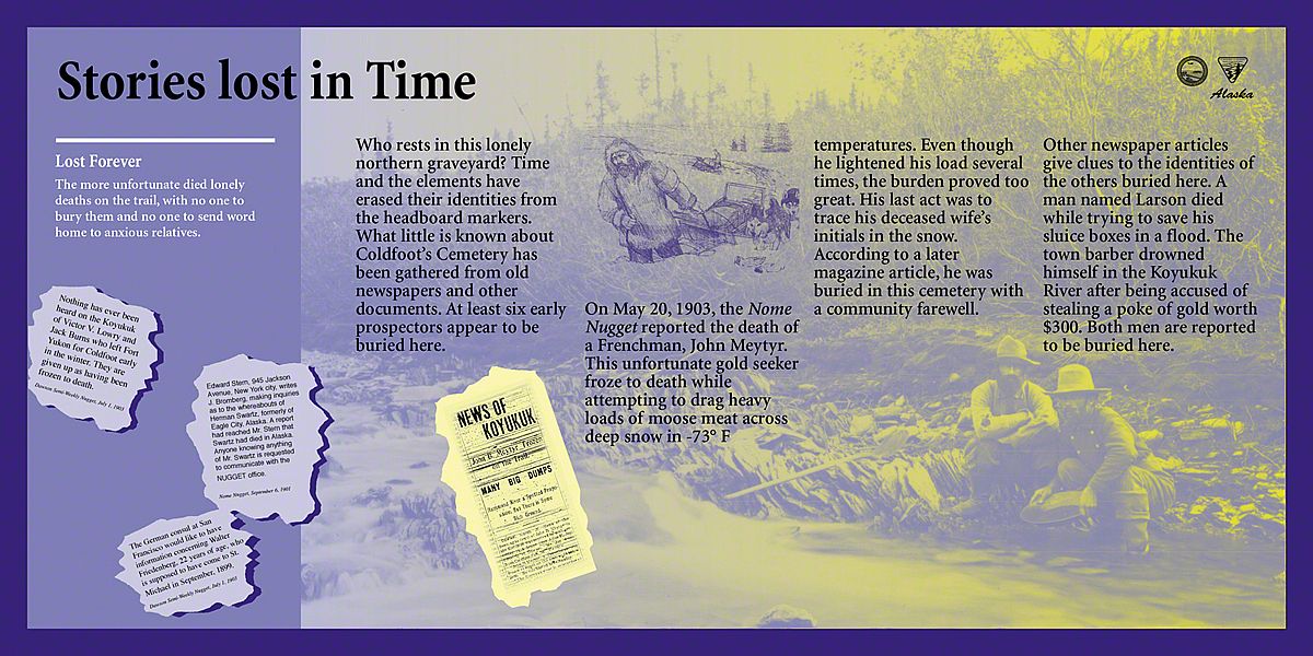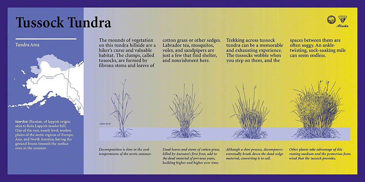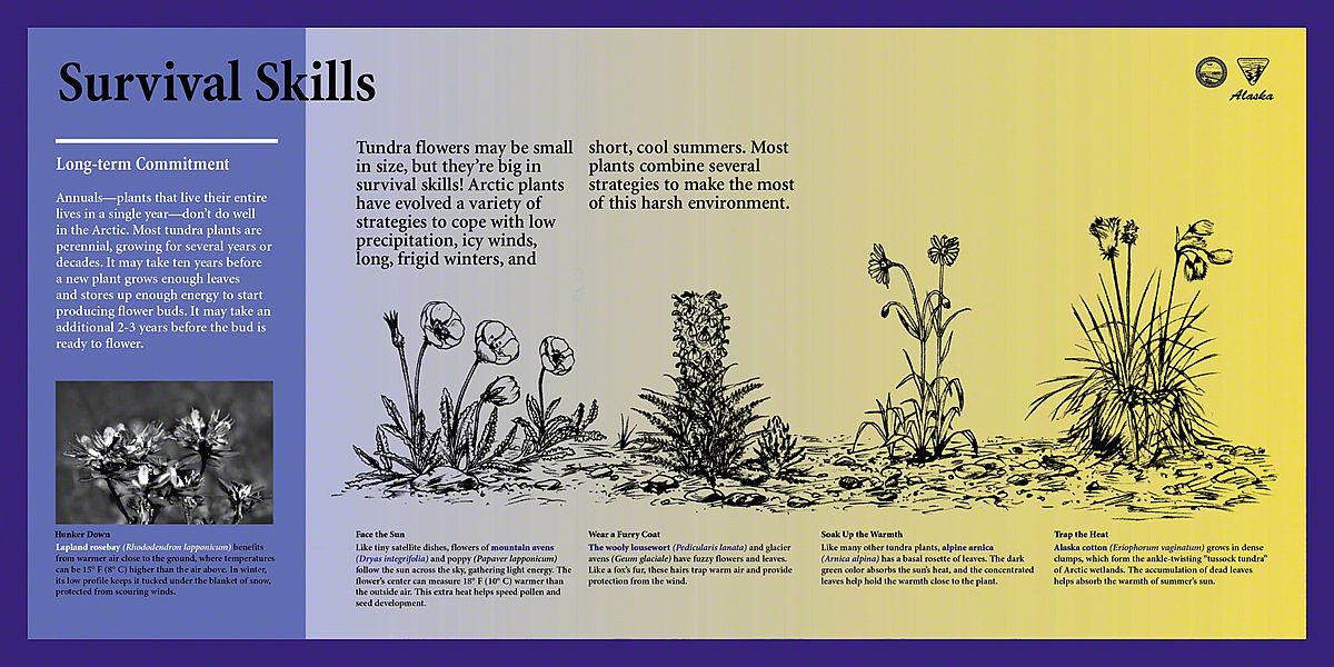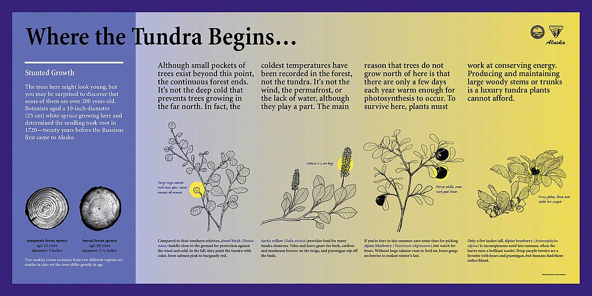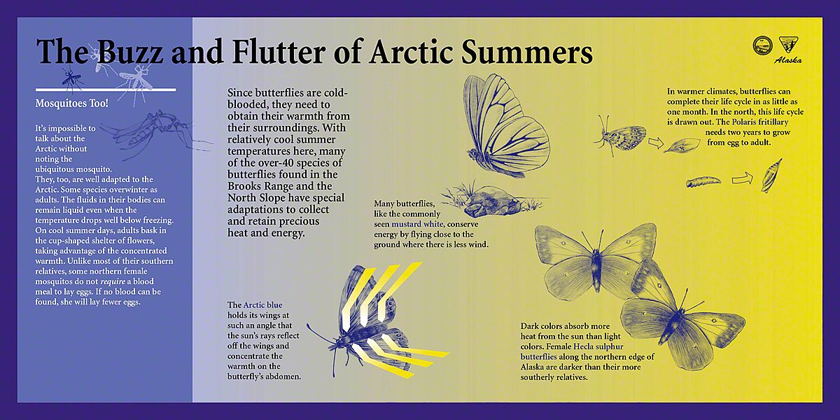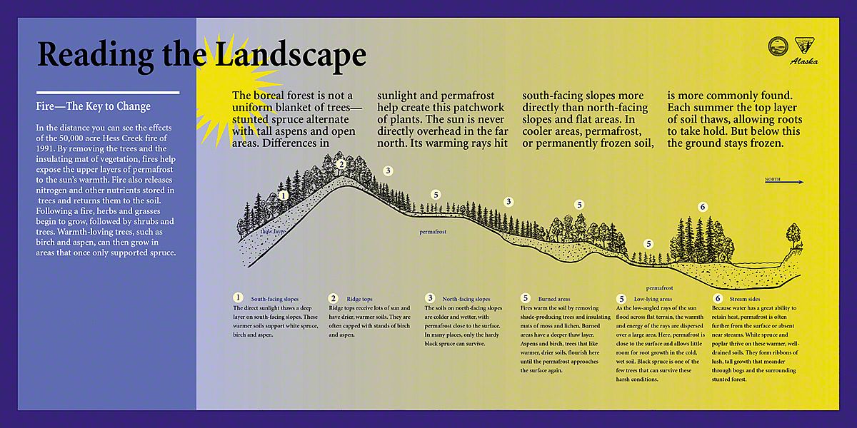 What captured our imagination here, were the extremes - both in sunlight and in temperature. In the winter, this is a dark, frozen landscape with temperatures of fifty degrees below zero - so cold that the ground stays frozen year-round in a state called permafrost. In the summer, temperatures soar to over 100 degrees F and the sun shines late into the night. This inspired a color palette rich in indigo and bright yellow. Each exhibit has a sunny yellow background with a blend of lavender and deeper blues, signaling the transition between night and day, winter and summer, cold and warm.