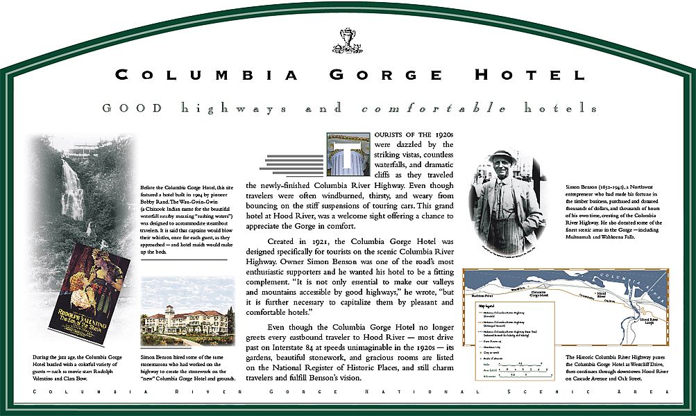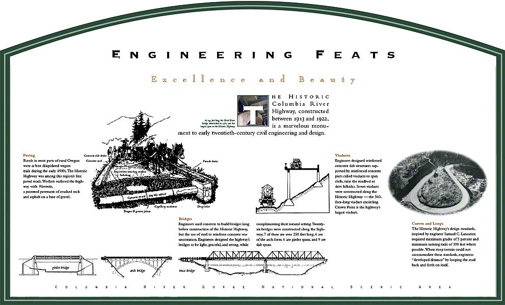 These panels address topics that range from construction of the Historic Highway to the natural history and geology of the Columbia River and the Gorge. They are installed along the 80-mile section of the old highway.