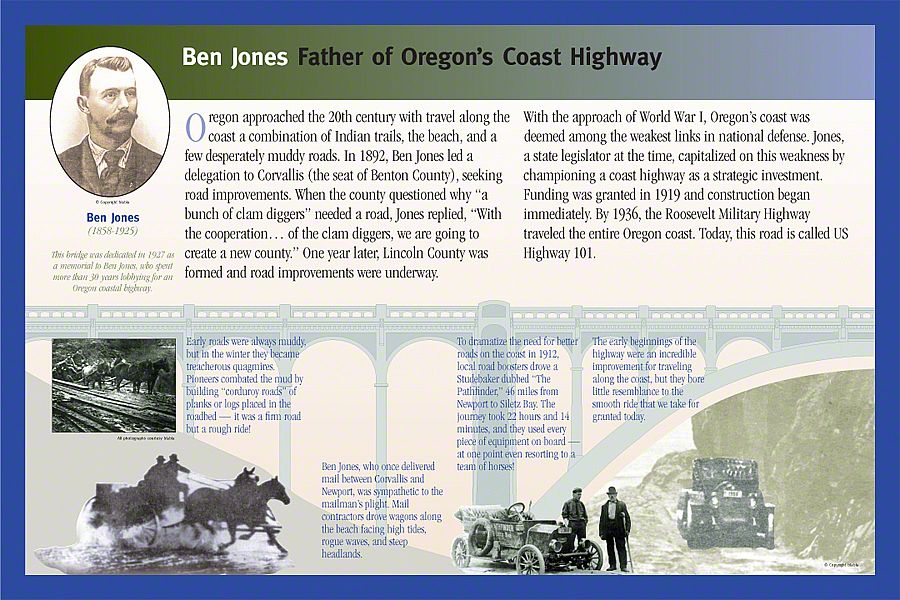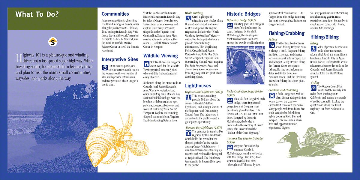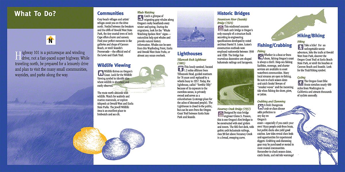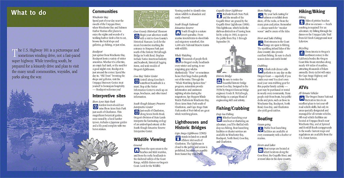 The Oregon Department of Transportation developed a number of sites along Oregon Highway 101 to provide visitors with information about local attractions, nearby sightseeing opportunities, and places to camp. Each site offers interpretation about the natural and cultural history of the area. Winchester Bay Wayfinding Point was the first in this series, installed January 1996.