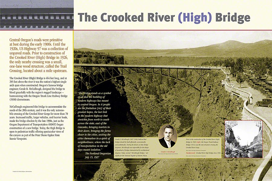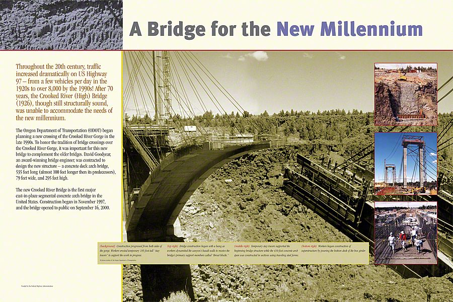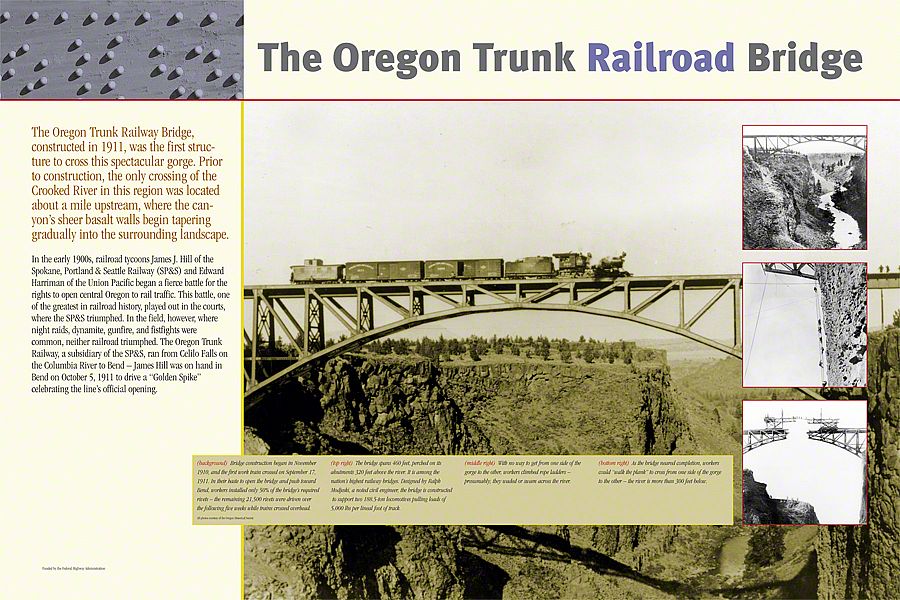 First, the Oregon Trunk Railroad Bridge, one of our nation's highest railway bridges, was completed in 1911 out of steel. The second, Crooked River (High) Bridge, was our nation's highest single arch span when it was constructed in 1926 - designed by Conde B. McCullough to carry automobile traffic. The new Crooked River Bridge, used today, was the first major cast-in-place segmental concrete arch bridge in the United States. Sea Reach designed and fabricated the interpretive signage for the park.