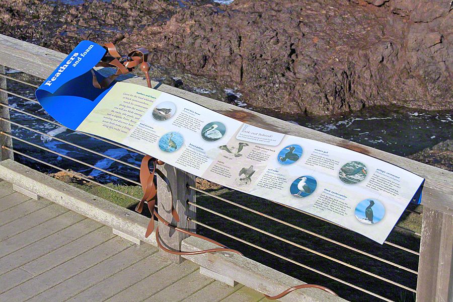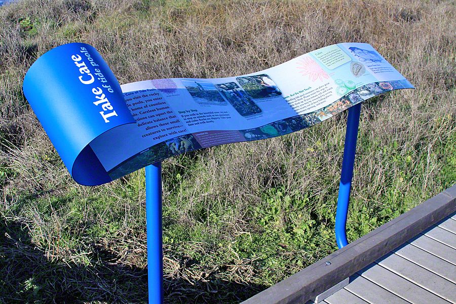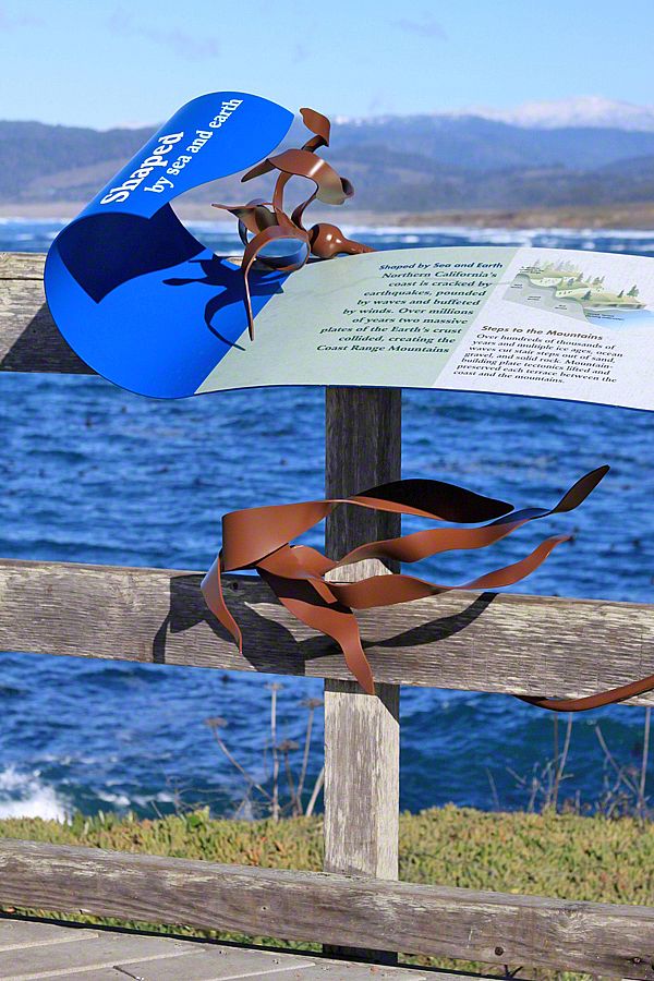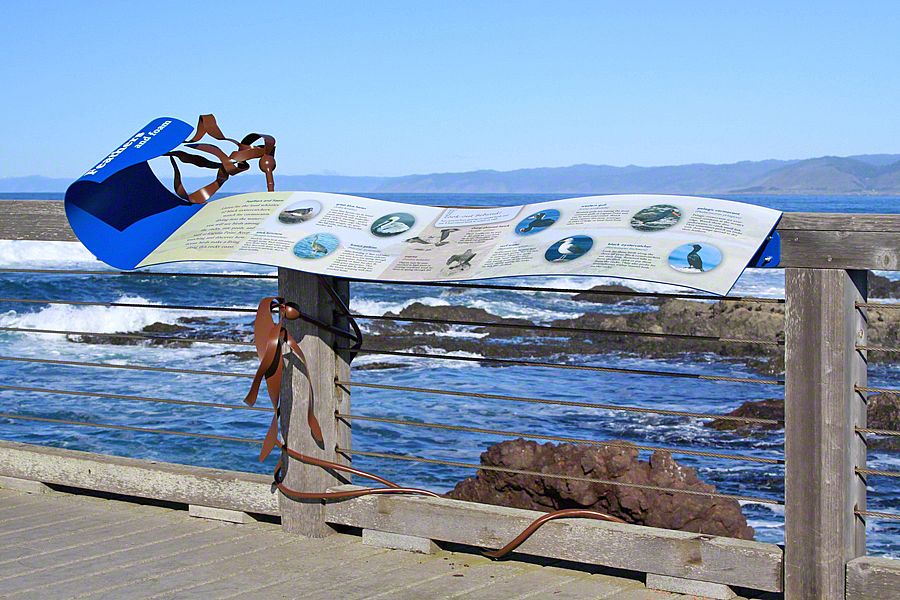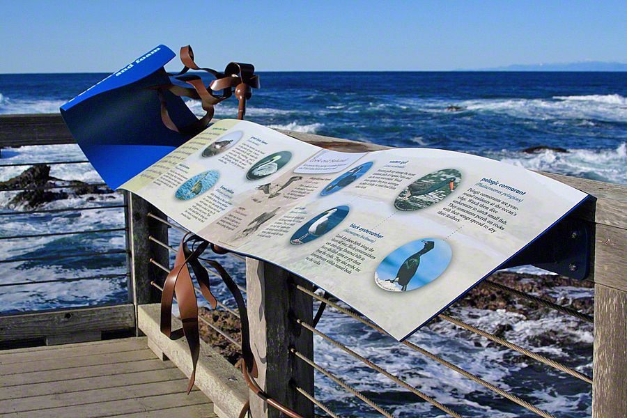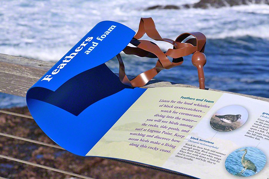 Sea Reach developed a custom design for these signs - long waves with bull kelp wrapped around the base. This playful design is a representation of the surrounding landscape, made possible by the kinds of materials used to fabricate the exhibits: aluminum, high pressure laminate, and shrinkable rubber tubing.