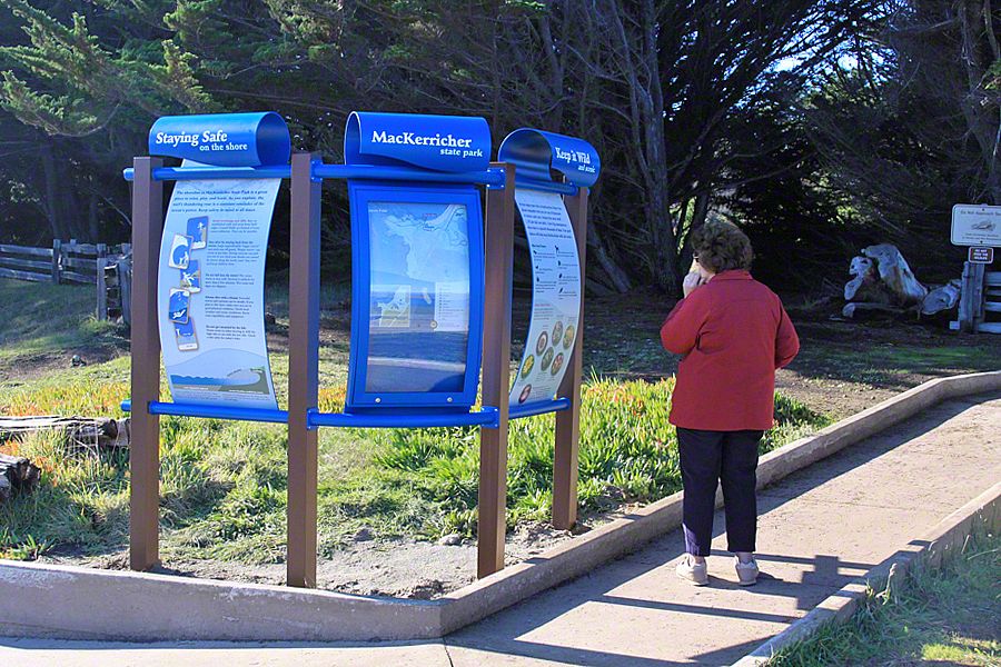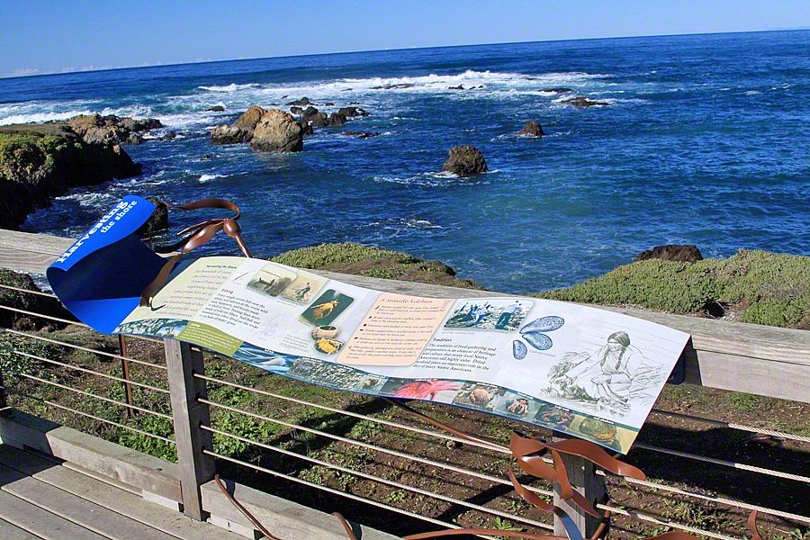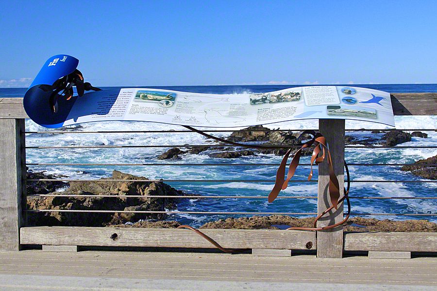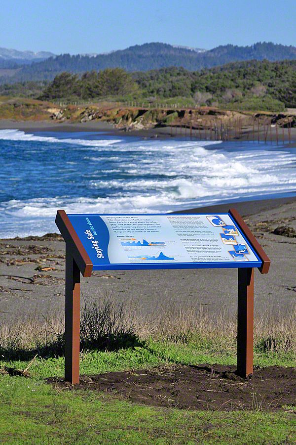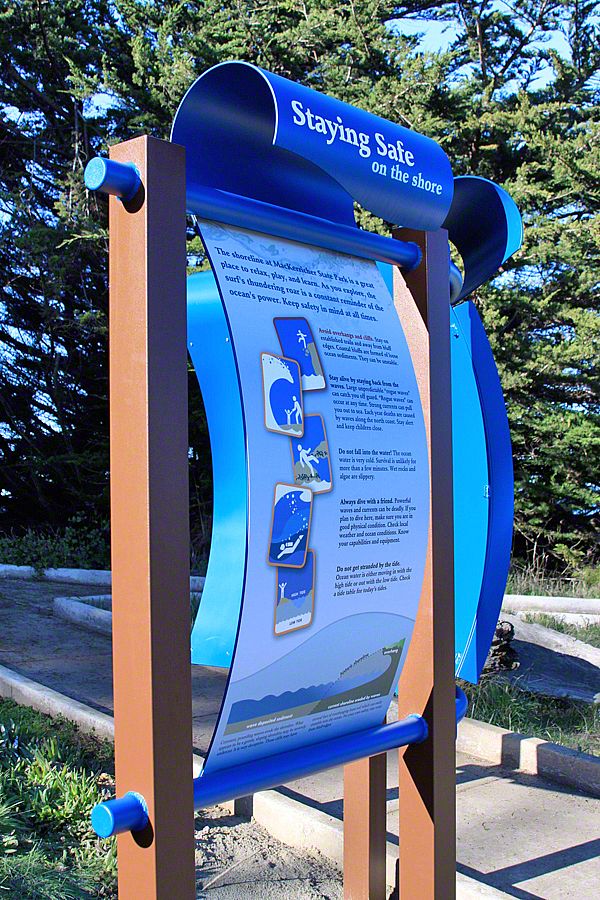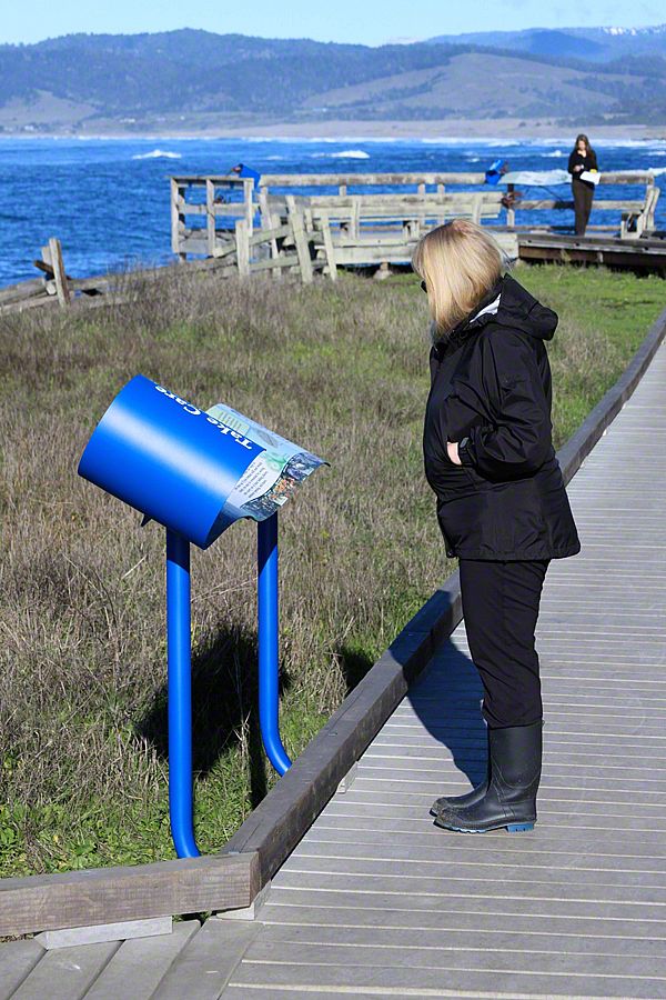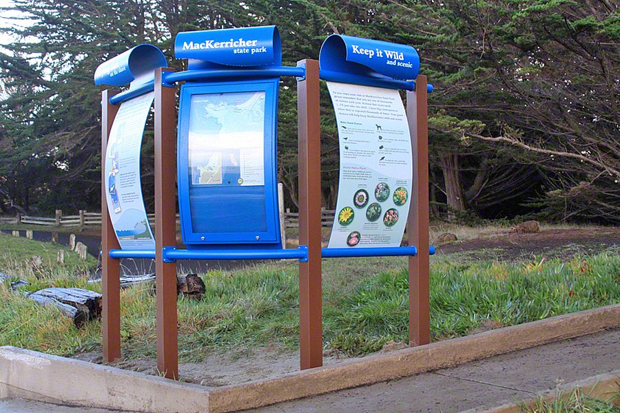 Sea Reach developed a custom design for these signs - long waves with bull kelp wrapped around the base. This playful design is a representation of the surrounding landscape, made possible by the kinds of materials used to fabricate the exhibits: aluminum, high pressure laminate, and shrinkable rubber tubing.