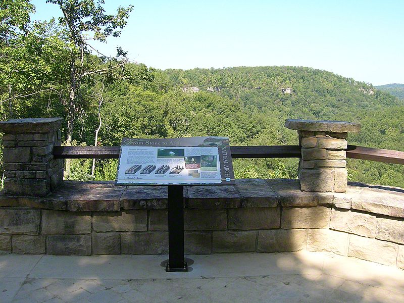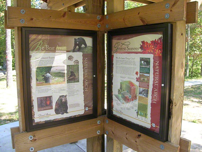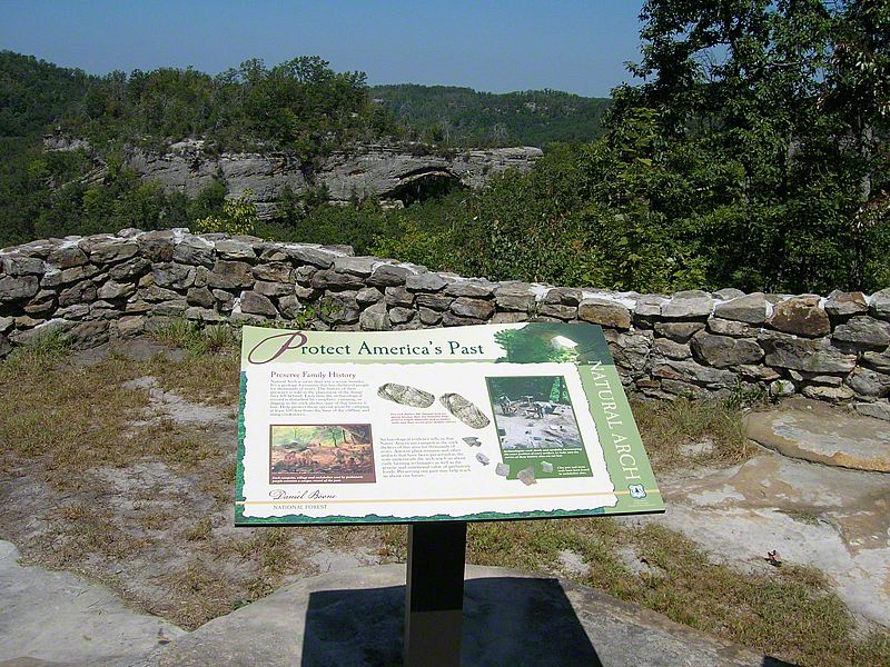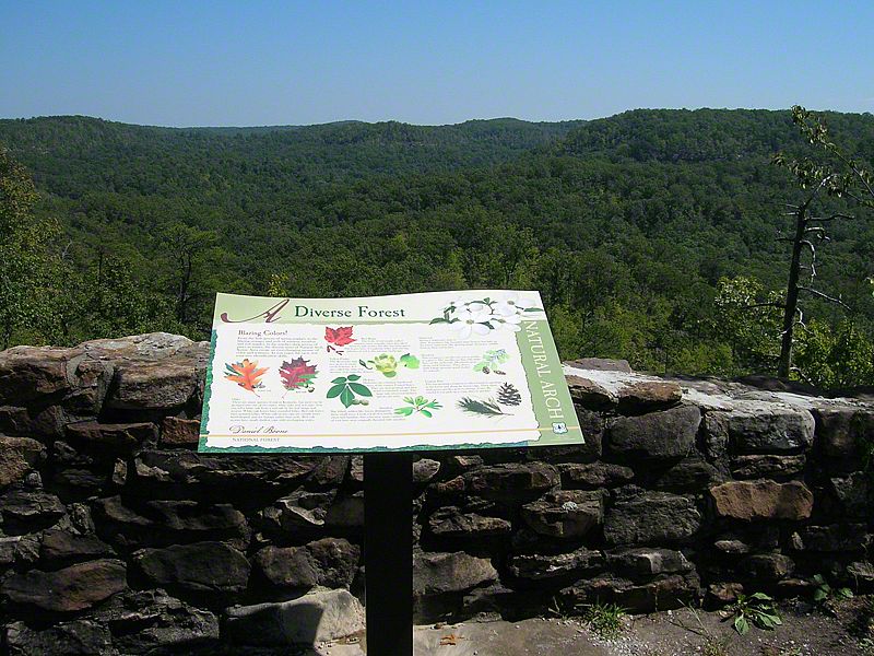 The eroded sandstone and conglomerate bedrock formations in the Daniel Boone National Forest, Kentucky, create amazing cliffs, overhangs, arches, pinnacles, "balancing rocks," and "lighthouse" holes. These formations have provided dry shelter for people for thousands of years. Today, archeologists have unearthed the fragile remains of ancient life preserved in these low-humidity areas - materials such as leather, seeds, and woven grass sandals. This unique forest provides habitat for plants and animals ranging from black bears to Rafinesque's big-eared bats, and Sassafras, which originally provided flavor for root beer, to little mountain meadow rue, which grows in the spray cliff habitat created by waterfalls. The many deciduous trees create amazing splashes of color in the fall. Interpretive exhibits give visitors interesting facts about this unique National Forest.