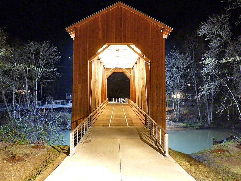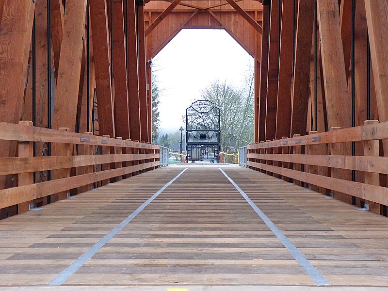 Chambers Bridge in Cottage Grove, Oregon is last the remaining covered railroad bridge west of the Mississippi River. It was nearly lost forever in 2006. The bridge was constructed in 1925 by lumberman J.H. Chambers to transport logs across the Coast Fork Willamette River to his sawmill. The bridge was in operation from 1925 to 1951. In the 1950's the railroad was sold for scrap and the bridge sat abandoned to weather and decay. The oversized timber construction designed to support the heavy loads of the steam locomotives and railcars loaded with logs sustained this bridge for over fifty years. In 2006, ownership was transferred to the City of Cottage Grove with the help of a million dollar grant award from the National Historic Covered Bridge Preservation Program saved this historic monument. The bridge is now listed on the National Historic Register (NRIS no.79002081).