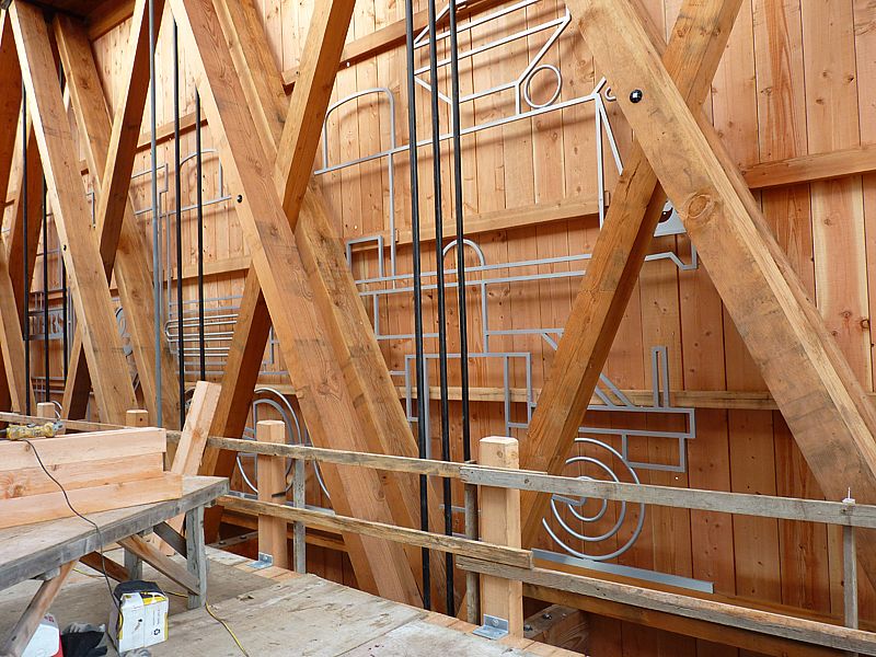 Many times an interpretive project's inspiration begins with the first question that pops into our minds - why does this bridge have such strange proportions? Even as tall and narrow as it is, the engine's smoke stack had to be shortened to accommodate this bridge. So we decided to recreate the engine crossing the bridge: life size. Sea Reach designed, fabricated and installed a life-size silhouette of the specific engine that crossed this bridge hundreds of times with loads of logs trailing behind. We did another one for outside that kids climb up on to get a sense of what the conductor saw as he approached the bridge. A large covered kiosk displays colorful exhibits featuring the history of the bridge, the logging operation and the City of Cottage Grove.