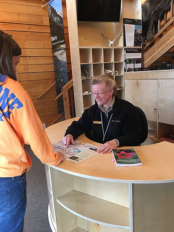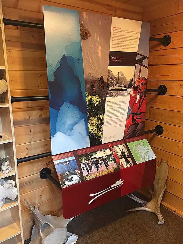 In the window alcove at the entrance are new benches for visitors to rest and plan their Alaskan adventure. Within arms reach are guide books, maps, and brochures. Hidden underneath a large map table is additional storage for the staff to use.