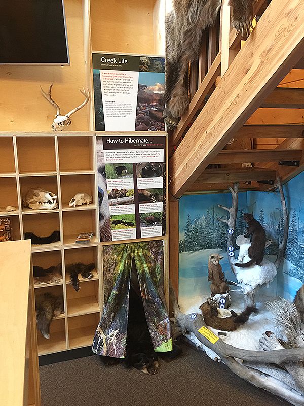 While a homey feeling can be attractive, and visitors have enjoyed the diverse objects and potpourri style, the Forest Service wanted us to re-think the approach in our new design: to take a more focused, thematic direction. Our challenge was to organize the space and create thematic exhibits to welcome and orient visitors to the Chugach NF—while also keeping some of the well-loved "legacy" elements such as curiosity cabinets and taxidermy displays.