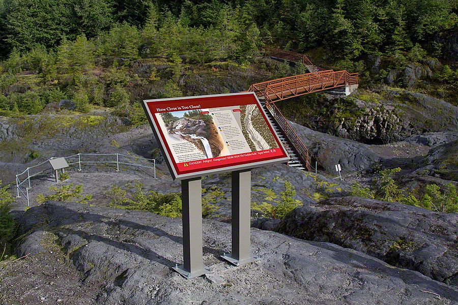 Today, the peacefulness felt in Lava Canyon is deceptive. A burbling creek enters the basalt canyon and unexpectedly hurtles 132-feet downward forming a spectacular and deadly waterfall. This waterfall has been responsible for at least three deaths since the Lava Canyon Trail opened. To help educate visitors and hikers about the dangers of the site, Sea Reach was asked to develop interpretive signs with drawings of the site showing the waterfall ahead and warning signs in multiple languages.