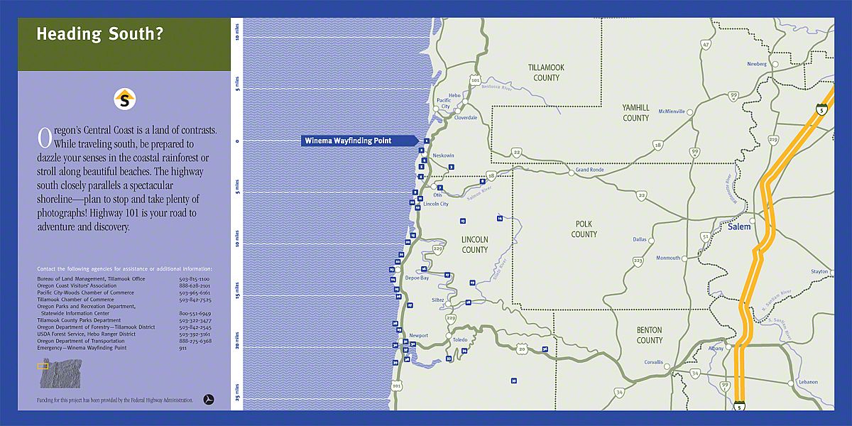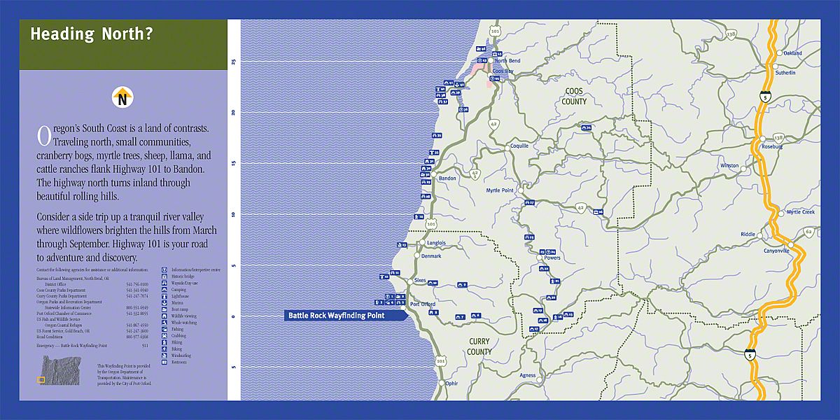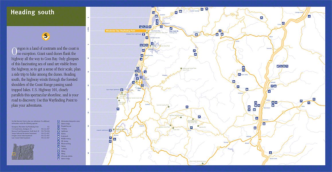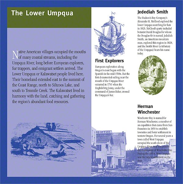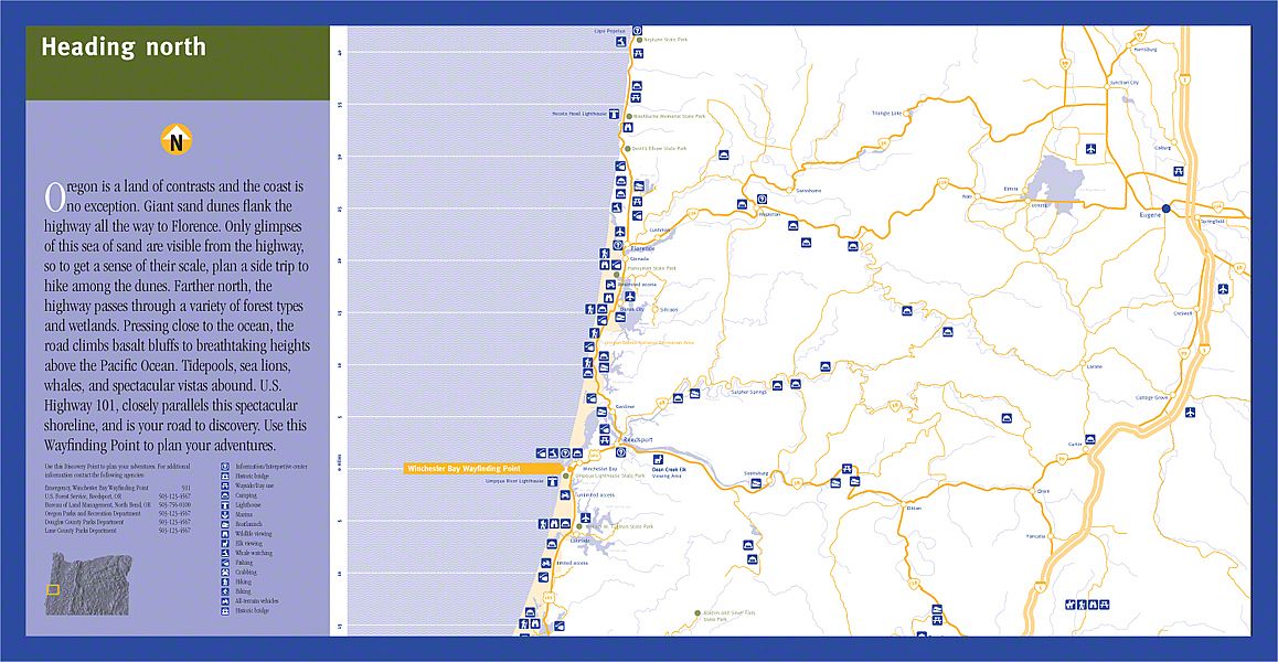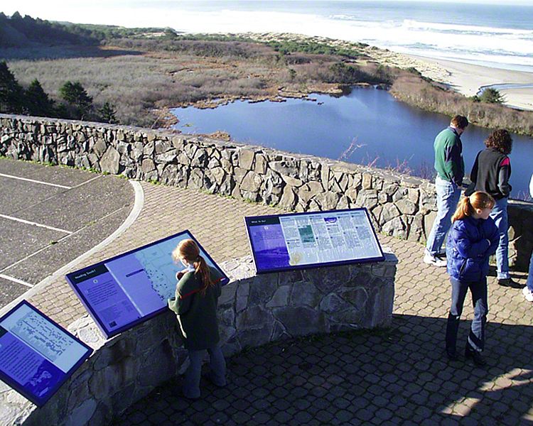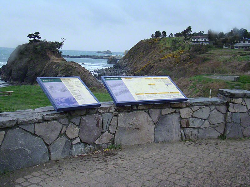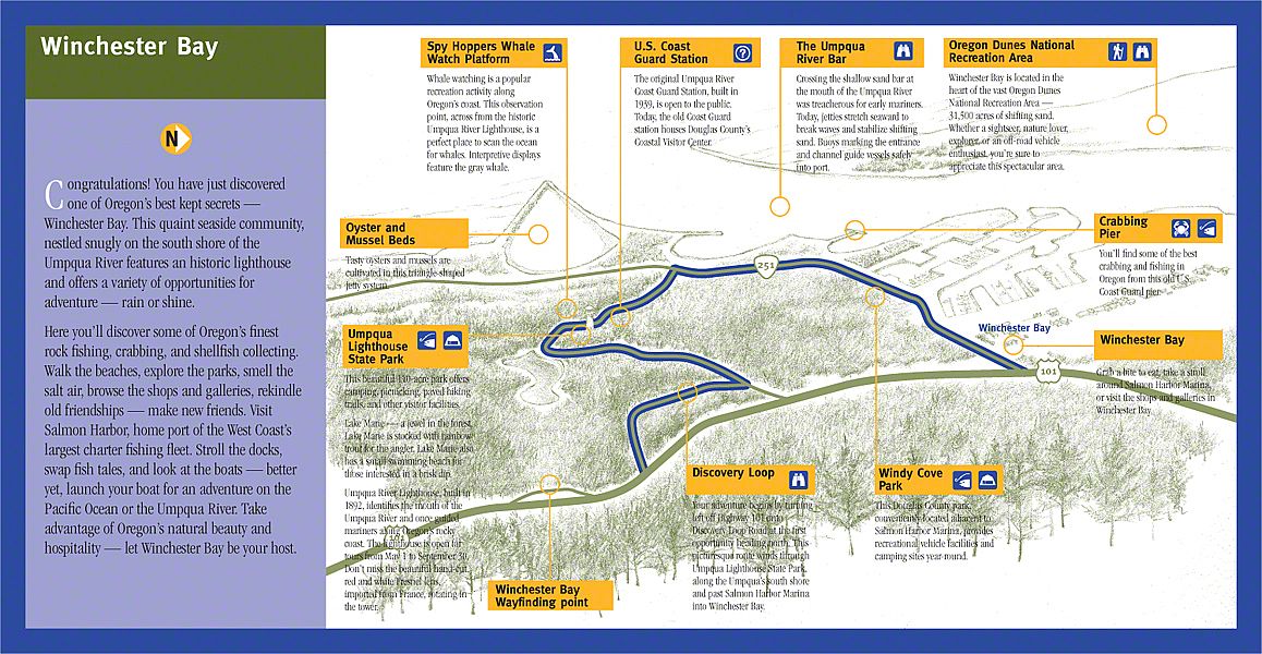 The Oregon Department of Transportation developed a number of sites along Oregon Highway 101 to provide visitors with information about local attractions, nearby sightseeing opportunities, and places to camp. Each site offers interpretation about the natural and cultural history of the area. Winchester Bay Wayfinding Point was the first in this series, installed January 1996.