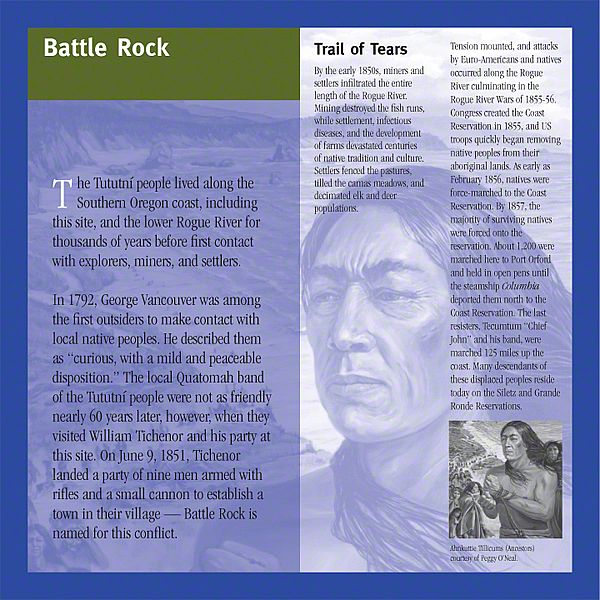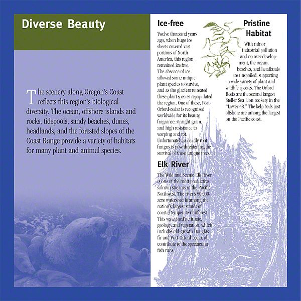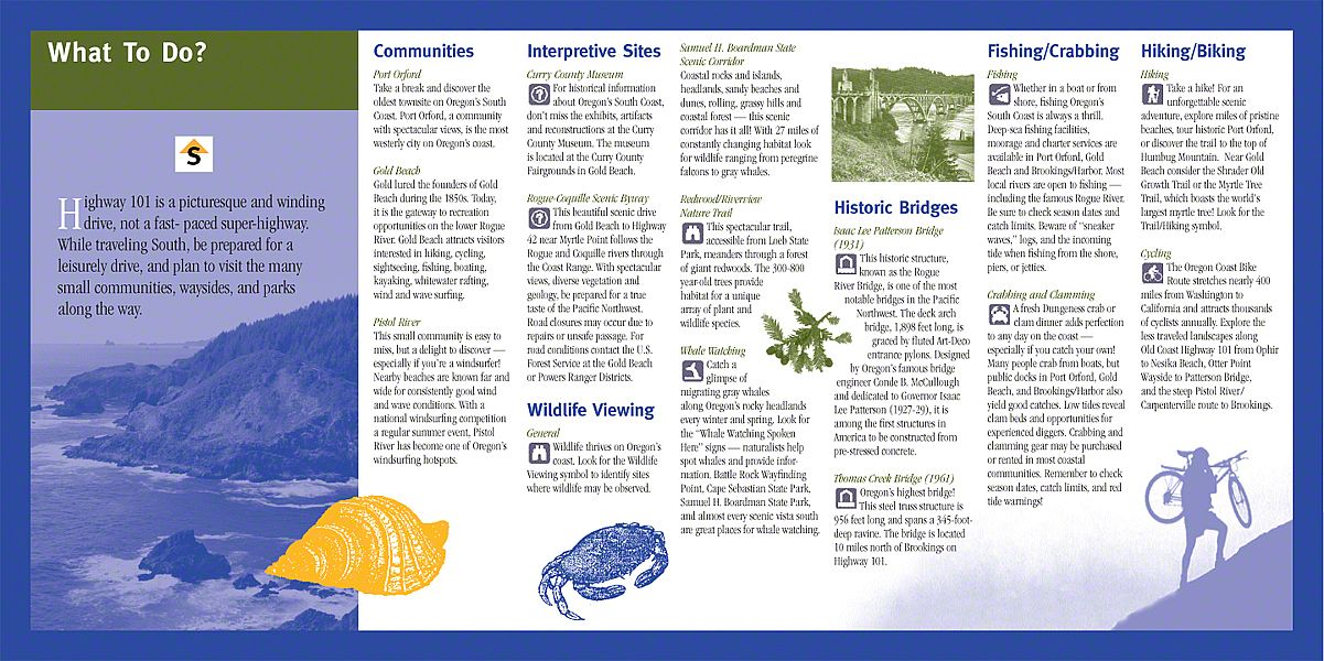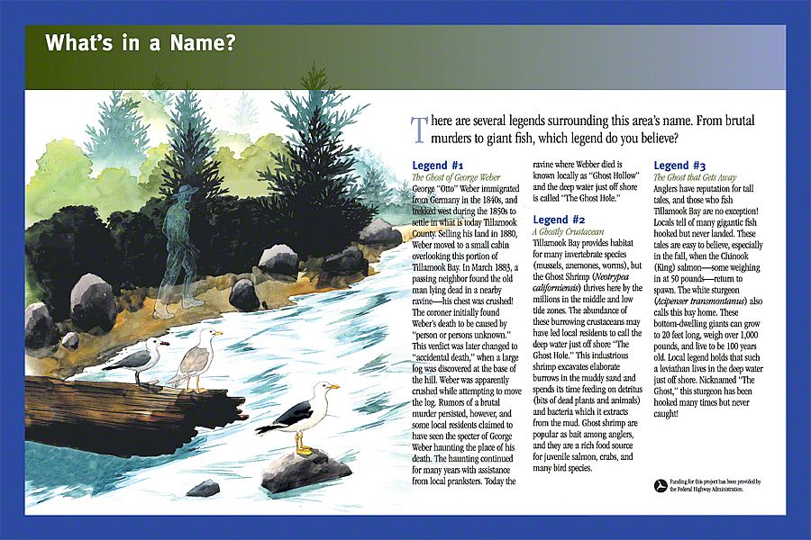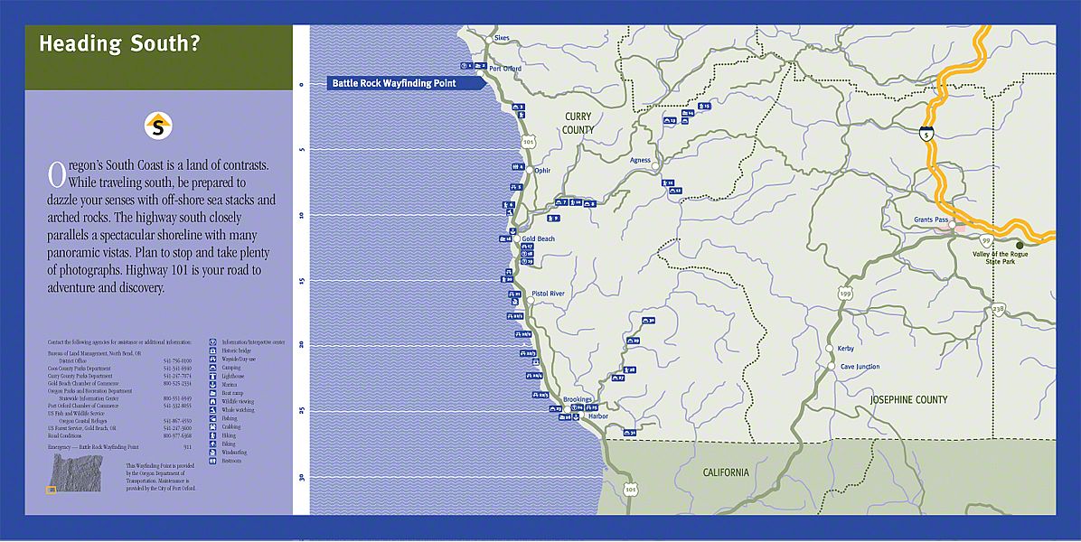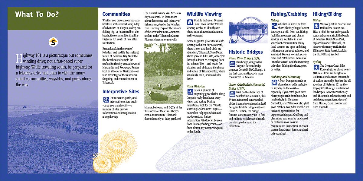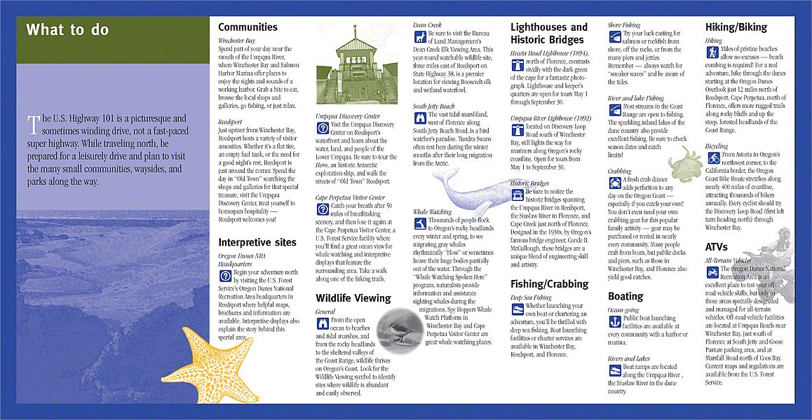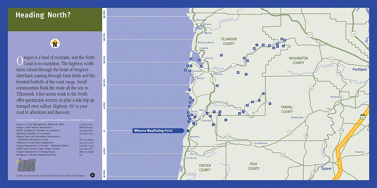 The Oregon Department of Transportation developed a number of sites along Oregon Highway 101 to provide visitors with information about local attractions, nearby sightseeing opportunities, and places to camp. Each site offers interpretation about the natural and cultural history of the area. Winchester Bay Wayfinding Point was the first in this series, installed January 1996.