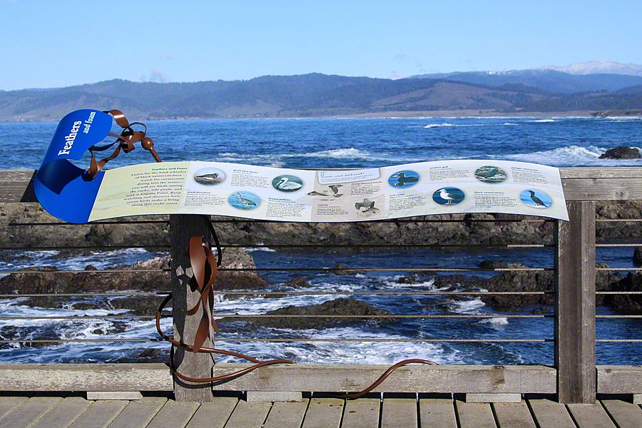 Sea Reach developed a custom design for these signs - long waves with bull kelp wrapped around the base. This playful design is a representation of the surrounding landscape, made possible by the kinds of materials used to fabricate the exhibits: aluminum, high pressure laminate, and shrinkable rubber tubing.