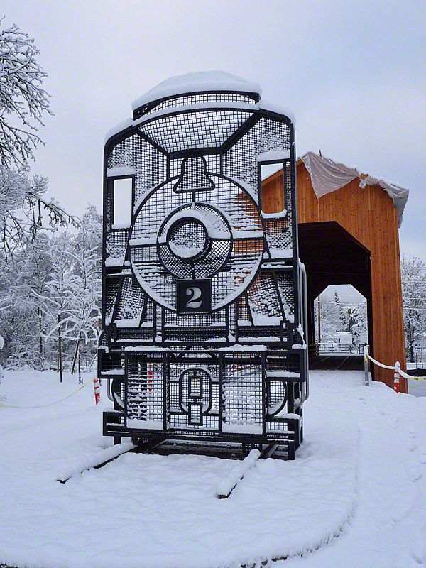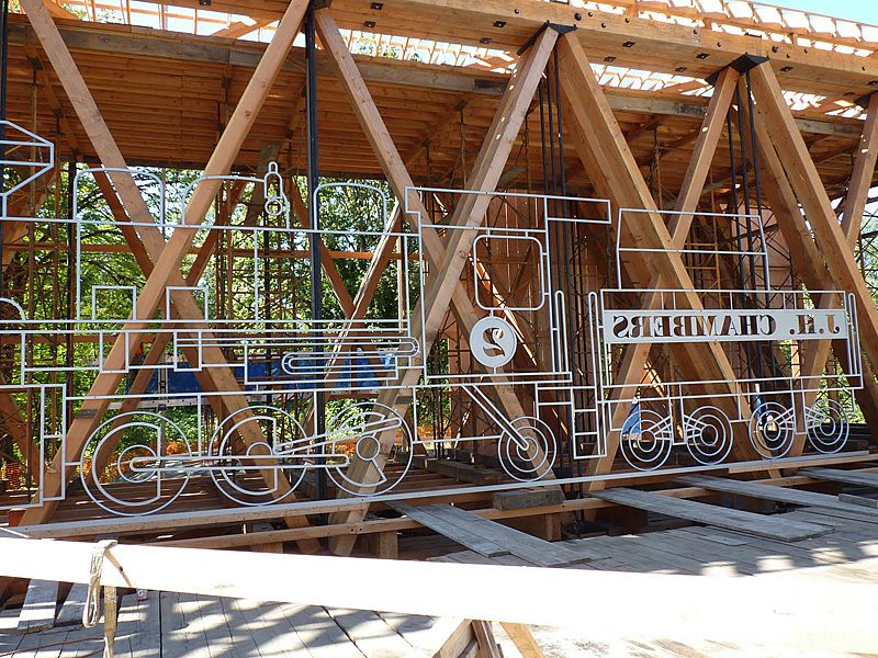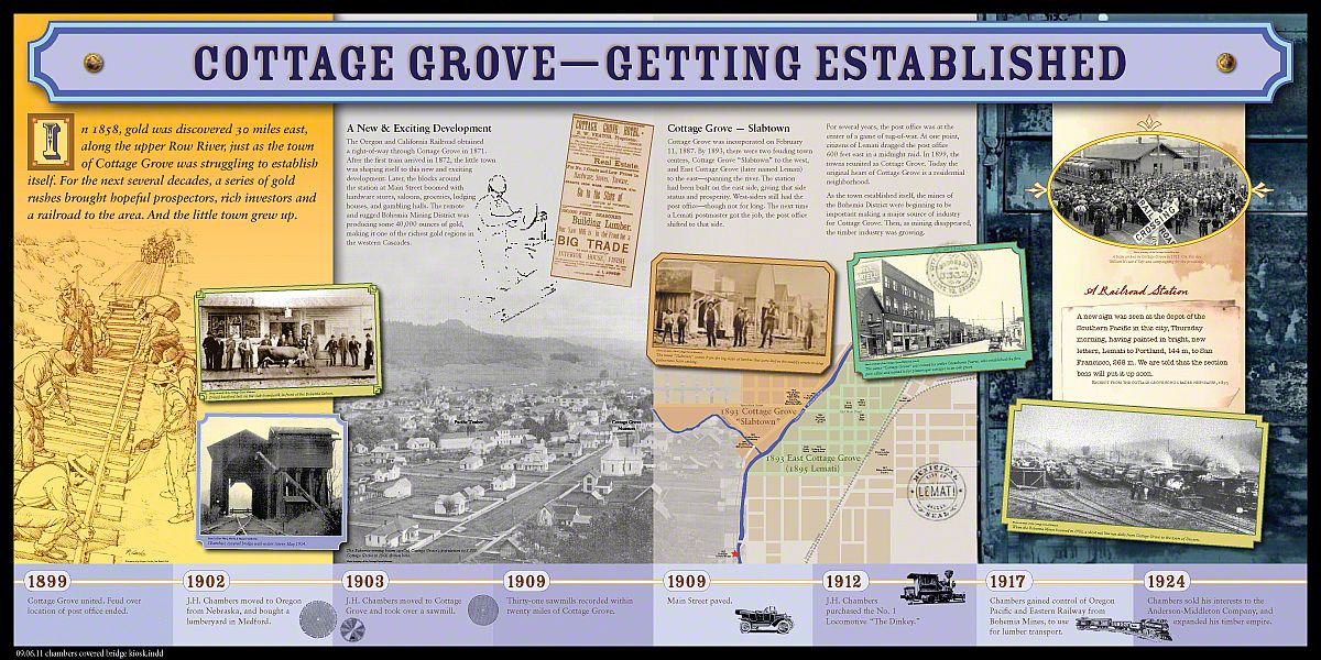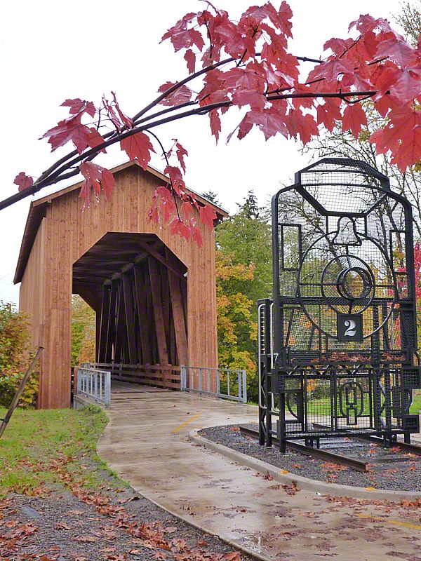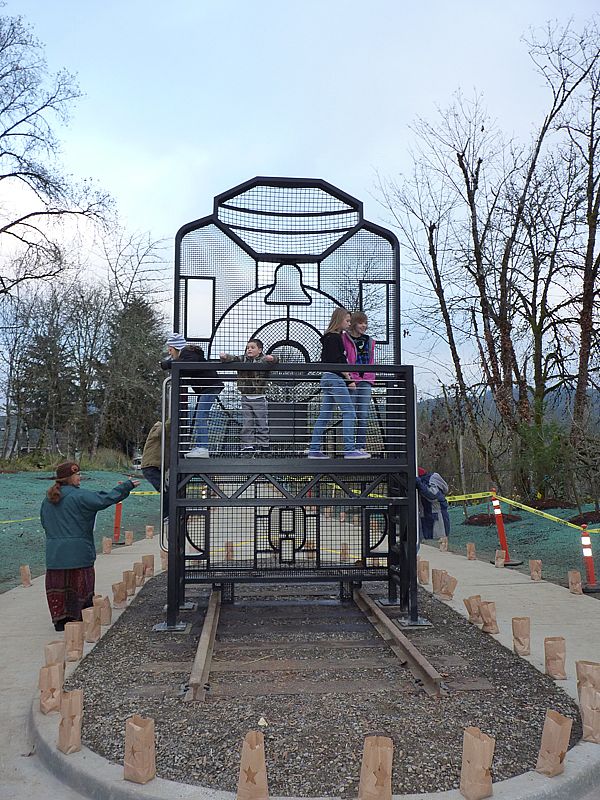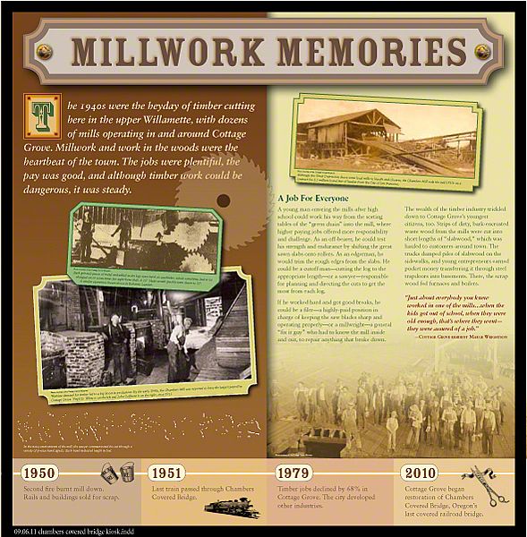 Many times an interpretive project's inspiration begins with the first question that pops into our minds - why does this bridge have such strange proportions? Even as tall and narrow as it is, the engine's smoke stack had to be shortened to accommodate this bridge. So we decided to recreate the engine crossing the bridge: life size. Sea Reach designed, fabricated and installed a life-size silhouette of the specific engine that crossed this bridge hundreds of times with loads of logs trailing behind. We did another one for outside that kids climb up on to get a sense of what the conductor saw as he approached the bridge. A large covered kiosk displays colorful exhibits featuring the history of the bridge, the logging operation and the City of Cottage Grove.