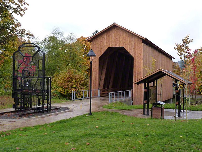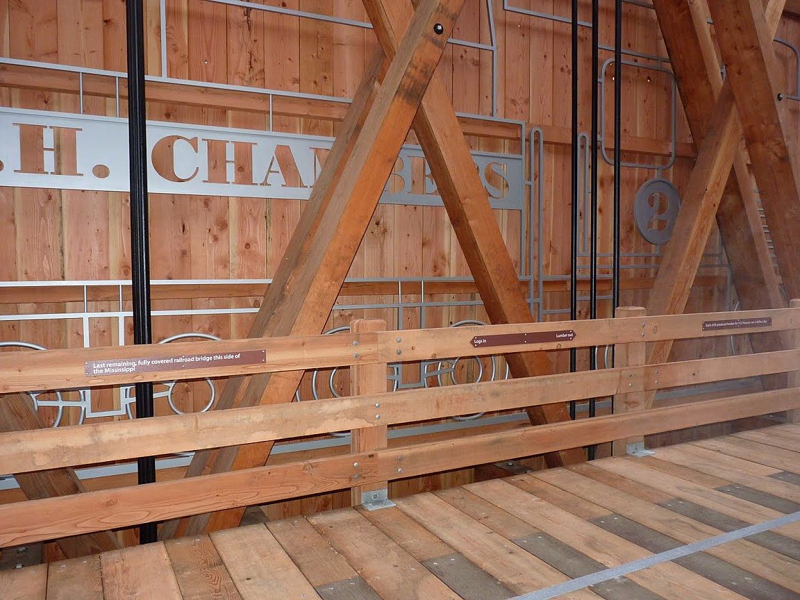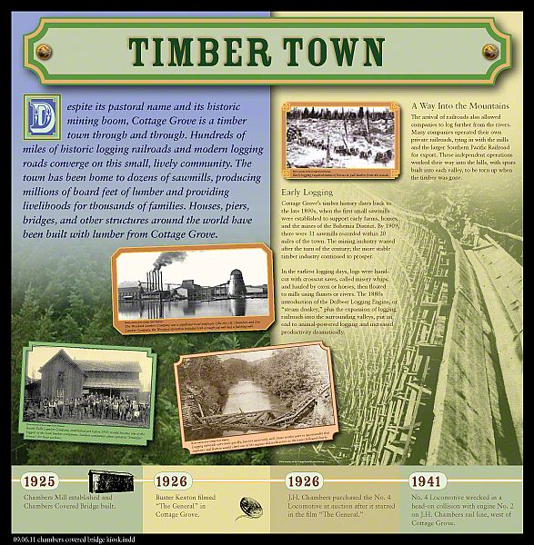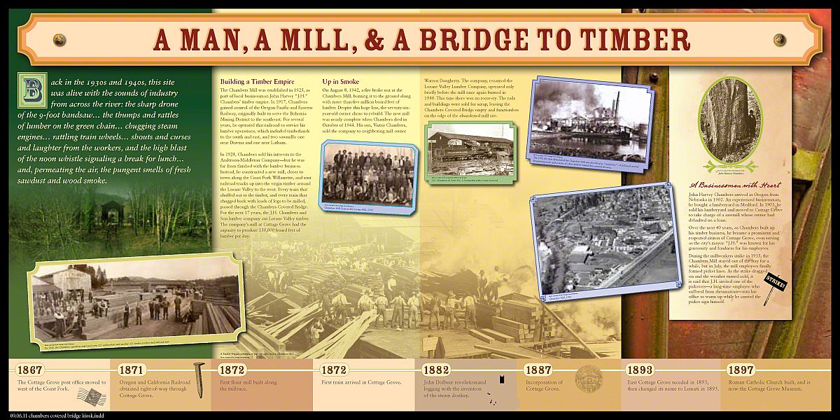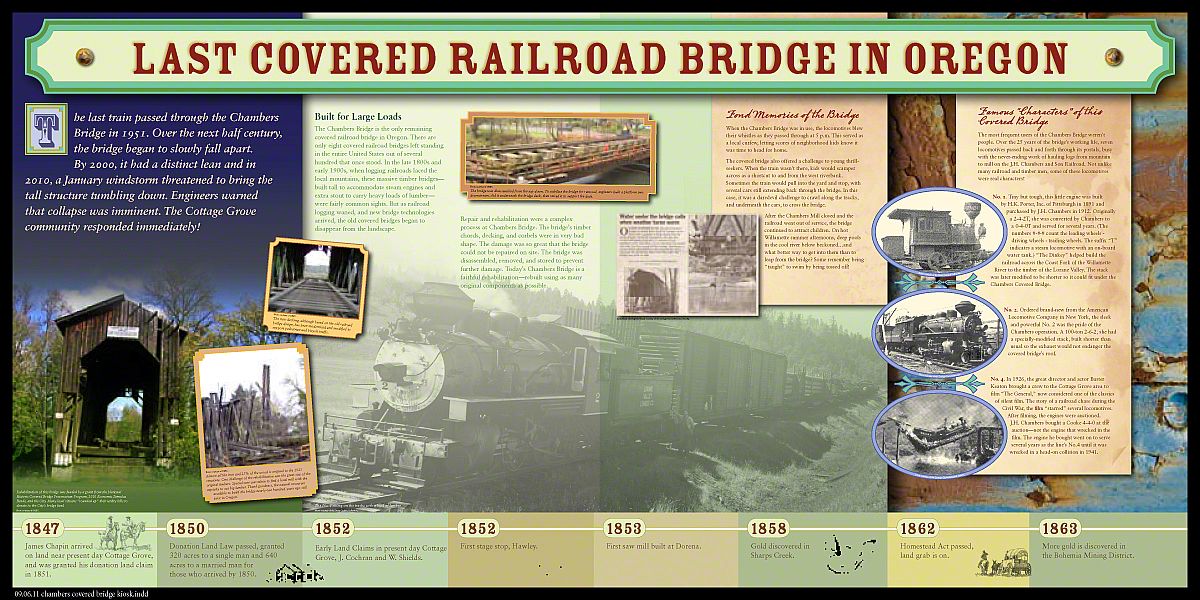 Chambers Bridge in Cottage Grove, Oregon is last the remaining covered railroad bridge west of the Mississippi River. It was nearly lost forever in 2006. The bridge was constructed in 1925 by lumberman J.H. Chambers to transport logs across the Coast Fork Willamette River to his sawmill. The bridge was in operation from 1925 to 1951. In the 1950's the railroad was sold for scrap and the bridge sat abandoned to weather and decay. The oversized timber construction designed to support the heavy loads of the steam locomotives and railcars loaded with logs sustained this bridge for over fifty years. In 2006, ownership was transferred to the City of Cottage Grove with the help of a million dollar grant award from the National Historic Covered Bridge Preservation Program saved this historic monument. The bridge is now listed on the National Historic Register (NRIS no.79002081).