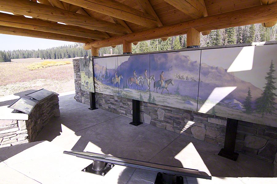 A year later, Sea Reach was contracted to fabricate and install all of the structures. The more challenging aspect of the project included two 20-foot-long murals to be featured at both overlook buildings. The murals were initially designed to hang from the wall, but during later discussions with the Forest Service landscape architect, we decided to build a structure to display the mural in front of the wall. This created an interesting challenge. The structure needed to be modular for shipping and installation, light so that one person could install it without big equipment, and the materials needed to be able to withstand extreme temperature and exposure.